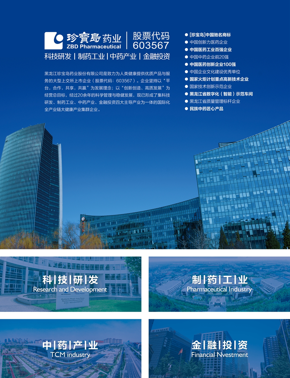 黑龍江珍寶島藥業(yè)股份有限公司(603567.SH)創(chuàng)立于1996年。公司以“為世界提供優(yōu)質(zhì)健康產(chǎn)品與服務(wù)”為企業(yè)使命,以“平臺 合作 共享 共贏”為發(fā)展理念,堅持“一心三園四平臺”發(fā)展戰(zhàn)略,以“六位一體”運(yùn)營模式推動企業(yè)經(jīng)營轉(zhuǎn)型。打造醫(yī)藥行業(yè)新質(zhì)生產(chǎn)力的重要平臺,加快科技研發(fā)成果轉(zhuǎn)化與應(yīng)用,積極參與國家醫(yī)藥產(chǎn)業(yè)項(xiàng)目建設(shè)。珍寶島藥業(yè)長期穩(wěn)居中國醫(yī)藥工業(yè)百強(qiáng)、中國中藥企業(yè)前二十強(qiáng)行列。業(yè)務(wù)領(lǐng)域涉及科技研發(fā)、制藥工業(yè)、中藥產(chǎn)業(yè)、金融投資四大板塊。
